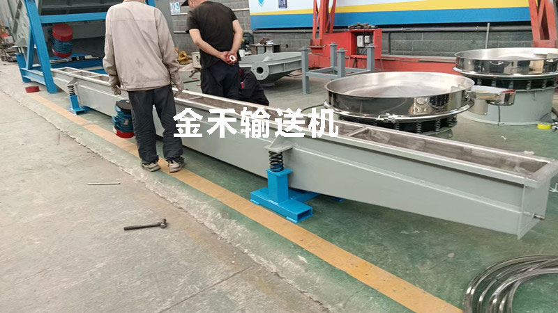 8米長不銹鋼振動輸送機,生產現(xiàn)場,用于食品行業(yè)中塊狀或顆粒狀物料的水平輸送使用。