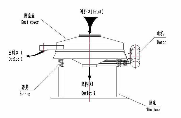 面粉雜質(zhì)過(guò)濾振動(dòng)篩篩分原理是振動(dòng)電機(jī)軸上下端的兩組偏心塊(不平衡偏心塊),將振動(dòng)電機(jī)的旋轉(zhuǎn)運(yùn)動(dòng)變?yōu)樗?、垂直、傾斜以及離心作用的多作用力重疊,再將這種作用力傳遞給篩面。改變上下偏心塊的相位角和重量,可以改變激振力的大小和物料的運(yùn)動(dòng)軌跡。