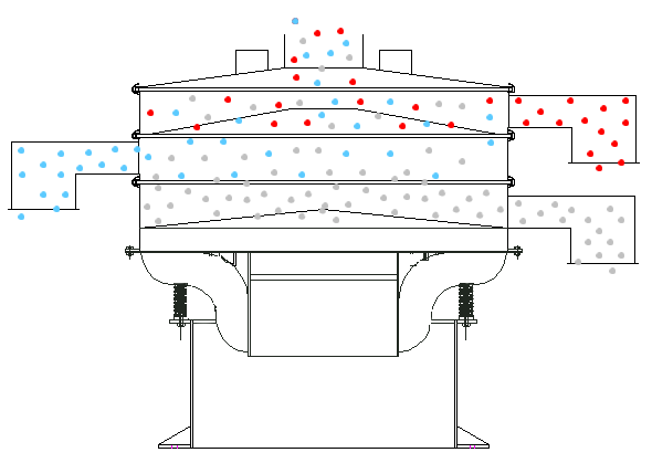振動篩實(shí)際的篩分過程是:大量粒度大小不同、粗細(xì)混雜的碎散物料進(jìn)入篩面后,只有一部分顆粒與篩面接觸,由于篩箱的振動,篩上物料層被松散,使大顆粒本來就存在的間隙被進(jìn)一步擴(kuò)大,小顆粒乘機(jī)穿過間隙,轉(zhuǎn)移到下層或運(yùn)輸機(jī)上。由于小顆粒間隙小,大顆粒并不能穿過,于是原來雜亂無章排列的顆粒群發(fā)生了分離,即按顆粒大小進(jìn)行了分層,形成了小顆粒在下,粗顆粒居上的排列規(guī)則。到達(dá)篩面的細(xì)顆粒,小于篩孔者透篩,最終實(shí)現(xiàn)了粗、細(xì)粒分離,完成篩分過程。